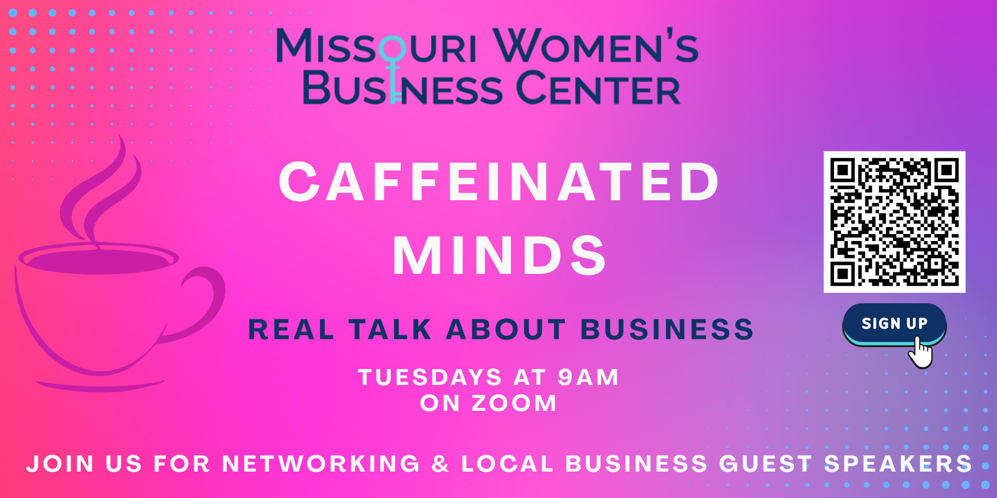 Caffeinated Minds serves as Missouri Women’s Business Center’s primary professional development program. Held virtually on Tuesdays from 9-10am, this forum features guest speakers from diverse business fields who discuss topics aligned with our monthly themes. Topics include marketing, bookkeeping, taxes, sales, HR best practices, budgeting, and other relevant subjects.
